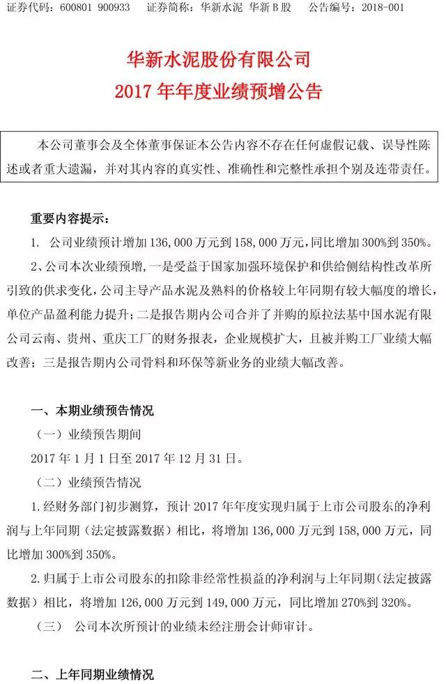 【水泥人網(wǎng)】華新水泥(600801)11日晚發(fā)布業(yè)績預告,預計2017年凈利同比將增加13.6億元到15.8億元,同比增加300%到350%。