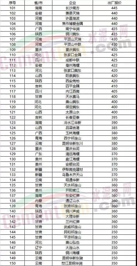 各區(qū)域企業(yè)PO42.5散裝水泥出廠報(bào)價(jià)(降價(jià)企業(yè))