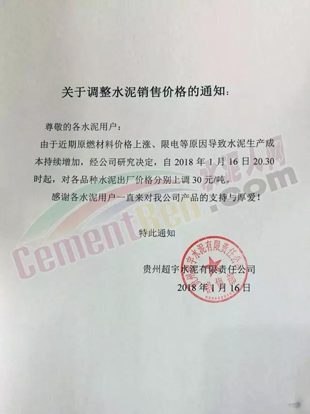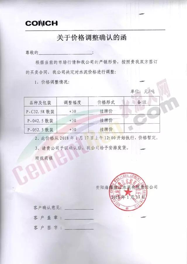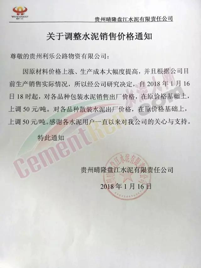 通知,根據(jù)當(dāng)前限電情況、市場(chǎng)形勢(shì)及我公司產(chǎn)銷情況,經(jīng)公司研究決定,2018年1月17日12點(diǎn)對(duì)P.C32.5、P.O42.5、P.O52.5散裝水泥價(jià)格分別上調(diào)30元/噸,感謝您長(zhǎng)期以來(lái)對(duì)貴陽(yáng)海螺的支持與惠顧。