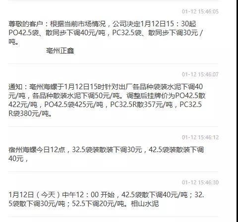 隨著海螺元月11日在華東地區(qū)熟料的降價,12日皖北地區(qū)的水泥價格也應聲而降。主導企業(yè)發(fā)布通知稱根據(jù)市場情況自12日下午三點起各企業(yè)水泥價格下調(diào)50-20元/噸。