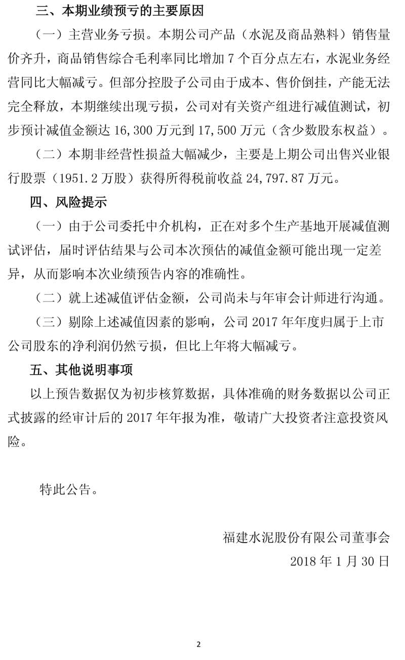 (一)主營業(yè)務(wù)虧損。本期公司產(chǎn)品(水泥及商品熟料)銷售量價齊升,商品銷售綜合毛利率同比增加7個百分點左右,水泥業(yè)務(wù)經(jīng)營同比大幅減虧。但部分控股子公司由于成本、售價倒掛,產(chǎn)能無法完全釋放,本期繼續(xù)出現(xiàn)虧損,公司對有關(guān)資產(chǎn)組進(jìn)行減值測試,初步預(yù)計減值金額達(dá)16,300萬元到17,500萬元(含少數(shù)股東權(quán)益)。