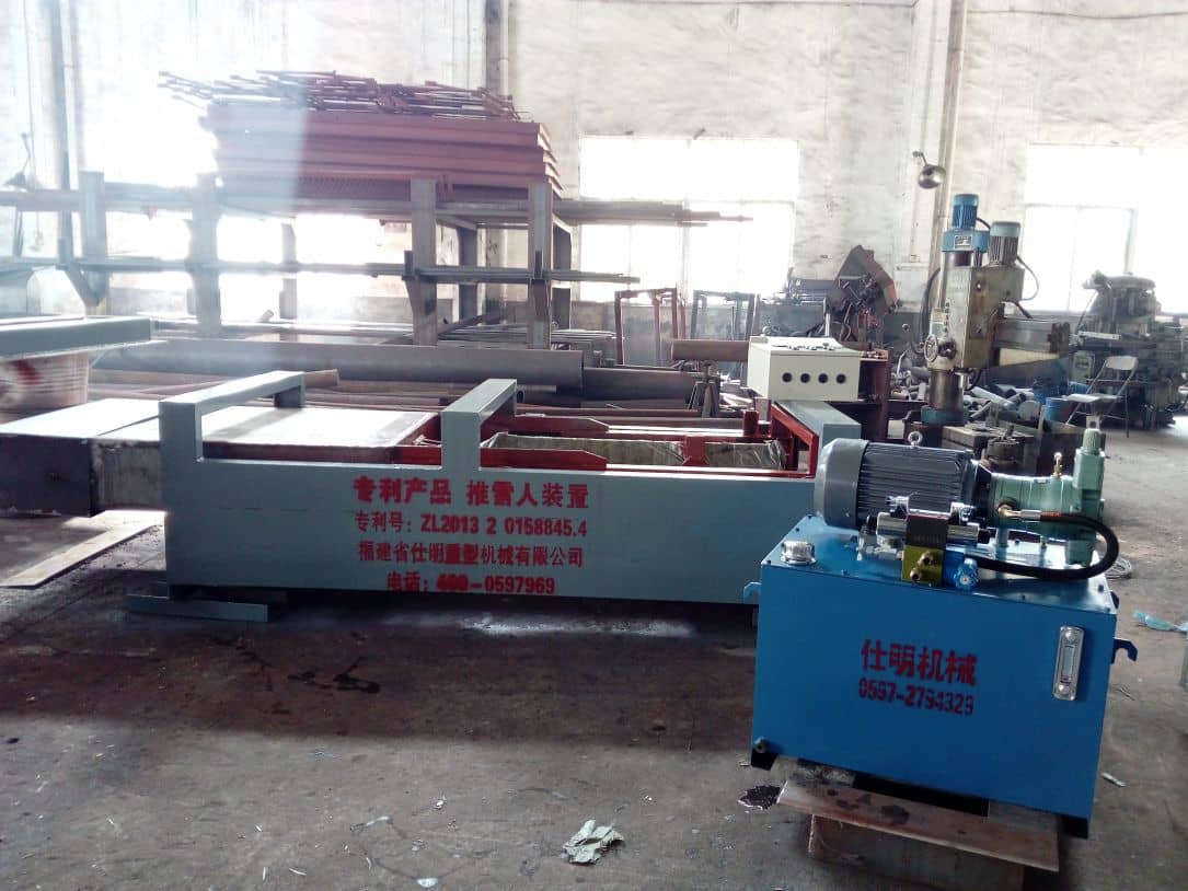 據(jù)王總介紹,SM 型推雪人機主要由耐熱不銹鋼推頭,行走導向機構,液壓缸,稀油站,密封裝置和位置控制開關等幾大部件組成。工作原理:當篦冷機需要清除其中的堆積料時,液壓缸啟動工作,帶動推頭前行,推翻“雪人”—把“根”推掉。清除完畢后,接觸到前行程開關液壓缸啟動回程,推頭回位遇后行程開關停止工作。