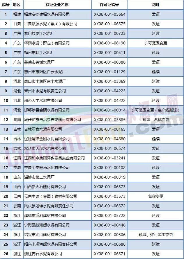 【水泥人網(wǎng)】國家質(zhì)檢總局于本月13日發(fā)放第二批26家水泥企業(yè)生產(chǎn)許可證,涉及河北、吉林 、廣東、山東、山西、福建、浙江、湖南、云南、江西、甘肅、寧夏等12個省自治區(qū)。其中新發(fā)證書12家企業(yè),涉及項目變更的5家企業(yè),到期延續(xù)的9家企業(yè)。詳細名單如下: