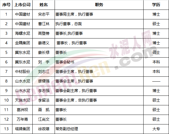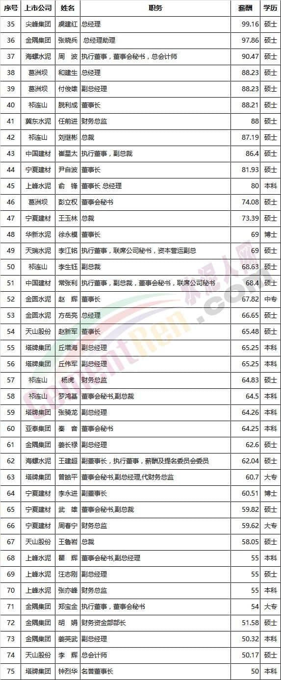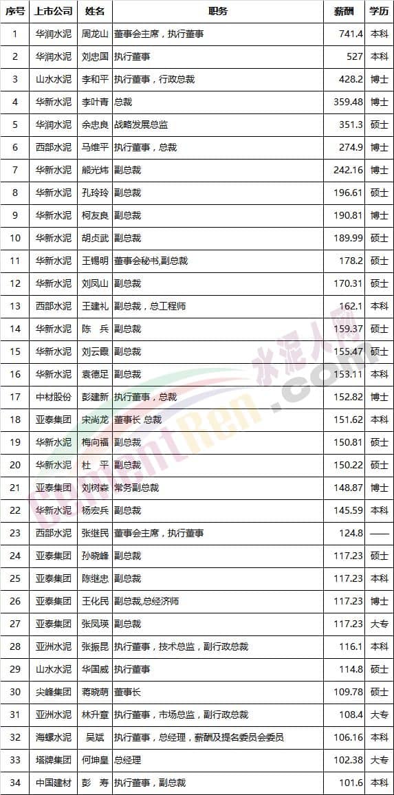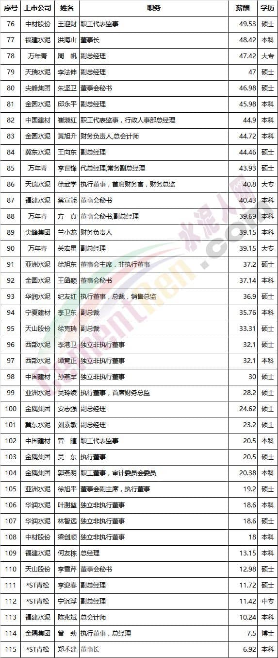 上數(shù)據(jù)僅為部分上市企業(yè)的高管年薪,同時(shí)因?yàn)椴糠?a href="http://www.ifaga.cn/news/list_2.html" target="_blank" class="keylink">水泥企業(yè)高管就職于集團(tuán)公司,而不從上市公司領(lǐng)取薪金,因此以上排名尚有不足之處,僅供參考。( 1港元=0.81元人民幣換算)。
