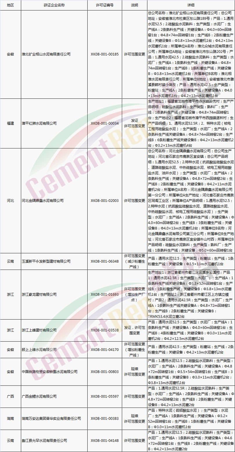 【水泥人網(wǎng)】國家質(zhì)檢總局于本月2日、8日分別放發(fā)本月第1批和批2批水泥企業(yè)生產(chǎn)許可證。其中涉及新發(fā)證書的23家,涉及到期延續(xù)的16家企業(yè),涉及變更的16家企業(yè)。