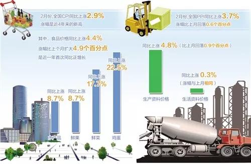交通銀行首席經濟學家連平分析認為,CPI同比上漲2.9%是近4年來的新高,也可能是今年年內的高位。今年春節(jié)假期全在2月,消費需求旺盛,與此同時,氣溫偏低影響食品生產供應。食品價格同比上漲4.4%,漲幅比上個月擴大4.9個百分點,是近一年來首次同比正增長。其中雞蛋、鮮菜、鮮果、水產品等食品價格大幅走高,同比漲幅分別達到22.5%、17.7%、8.7%、8.7%。此外,去年2月份CPI同比漲幅僅有0.8%,為全年最低,低基數(shù)對今年同期CPI有明顯的抬升作用。