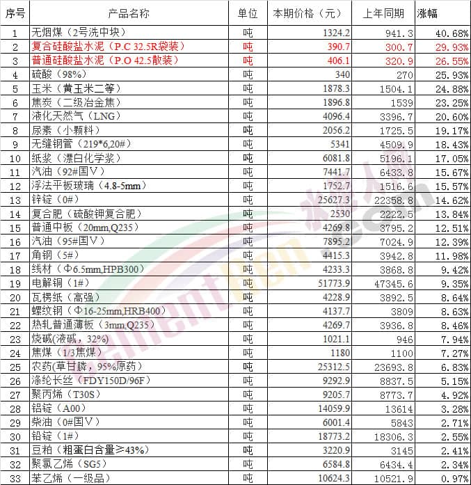 據(jù)國(guó)家統(tǒng)計(jì)局公布的流通領(lǐng)域50種重要生產(chǎn)資料市場(chǎng)價(jià)格變動(dòng)情況數(shù)據(jù)顯示,較上年同期價(jià)格上漲的有33種,占比達(dá)66%。也就是說(shuō)絕大多數(shù)生產(chǎn)資料近一年內(nèi)的價(jià)格都是上漲的。其中P.C 32.5R袋裝和P.O 42.5散裝水泥年漲幅近30%,無(wú)煙煤漲幅達(dá)40%以上。