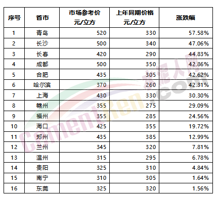 據(jù)水泥人網(wǎng)了解,近期各區(qū)域的商混產(chǎn)品價(jià)格也較上年有大幅的上漲,山東青島區(qū)域的C30混凝土漲幅近60%,湖南長(zhǎng)沙的漲幅近50%,吉林長(zhǎng)春的漲幅近45%等,詳情如下表: