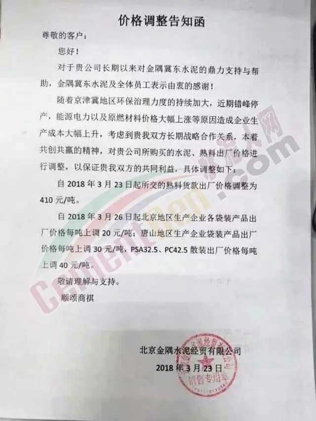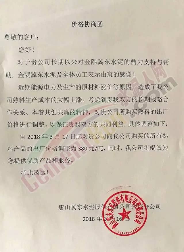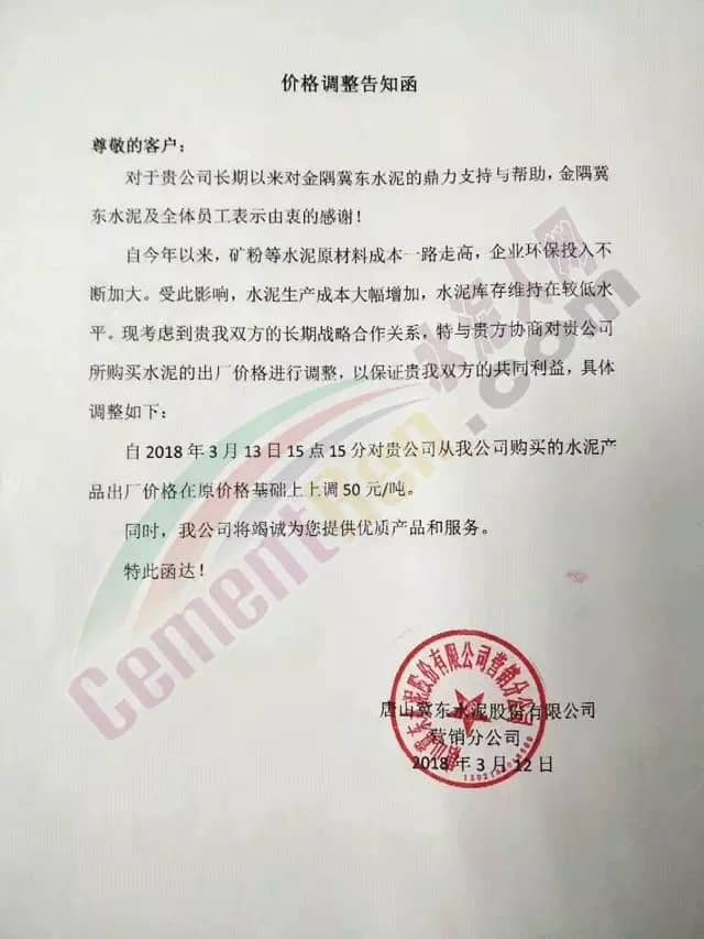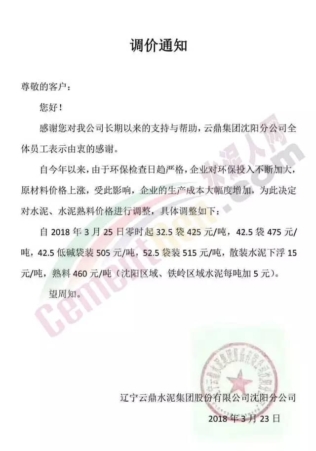 以山東山水水泥集團(tuán)有限公司、亞泰集團(tuán)、北方水泥有限公司、遼寧恒威水泥集團(tuán)、大連水泥集團(tuán)、撫順大伙房水泥有限公司,六家企業(yè)共同成立的云鼎水泥集團(tuán)也發(fā)布了漲價涵!