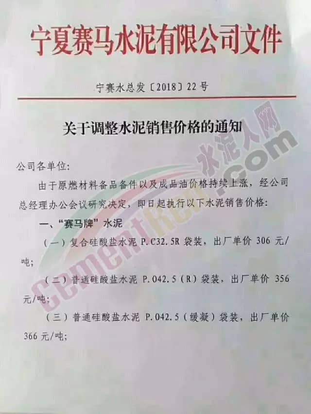 水泥人網(wǎng)通訊員消息,近期寧夏地區(qū)多家企業(yè)也發(fā)布了調(diào)價通知,其中區(qū)域主導(dǎo)企業(yè)賽馬水泥調(diào)價通知稱:由于原燃材料備品備件以及成品油價格持續(xù)上漲,經(jīng)公司總經(jīng)理辦公室會議研究決定,即日起公司旗下“賽馬”牌、“雙鹿”牌執(zhí)行新發(fā)布價格。寧東分廠出廠的各品種水泥出廠價以此基礎(chǔ)上再上調(diào)10元/噸。調(diào)價通知如下: