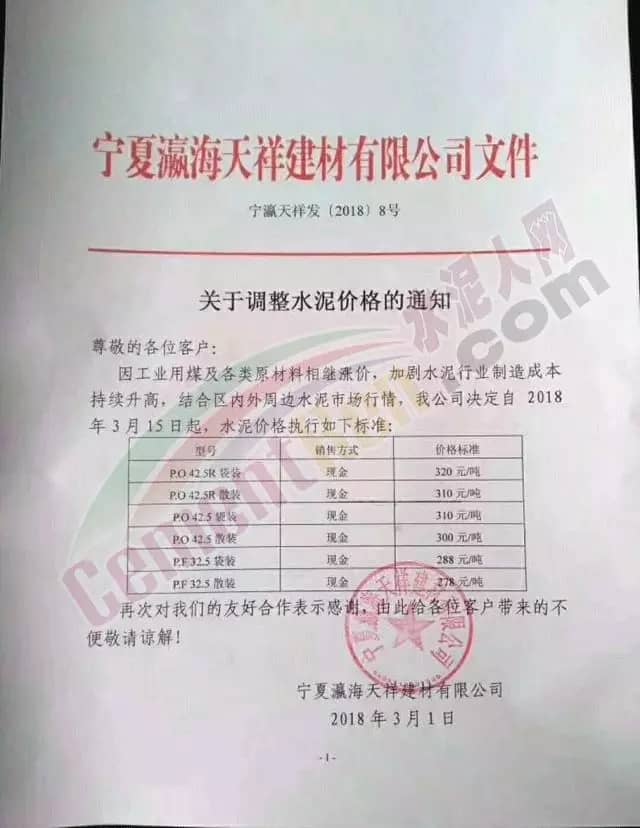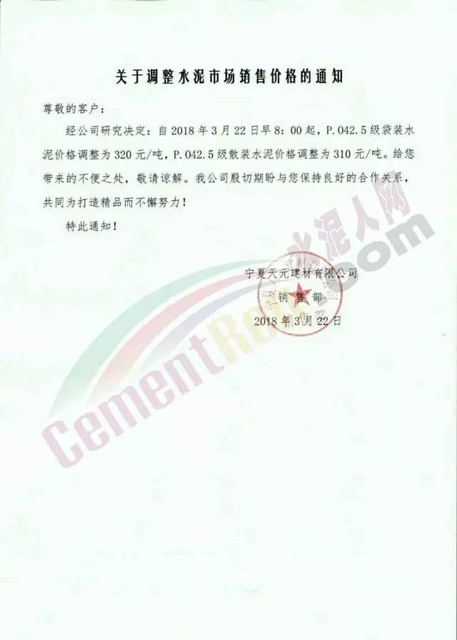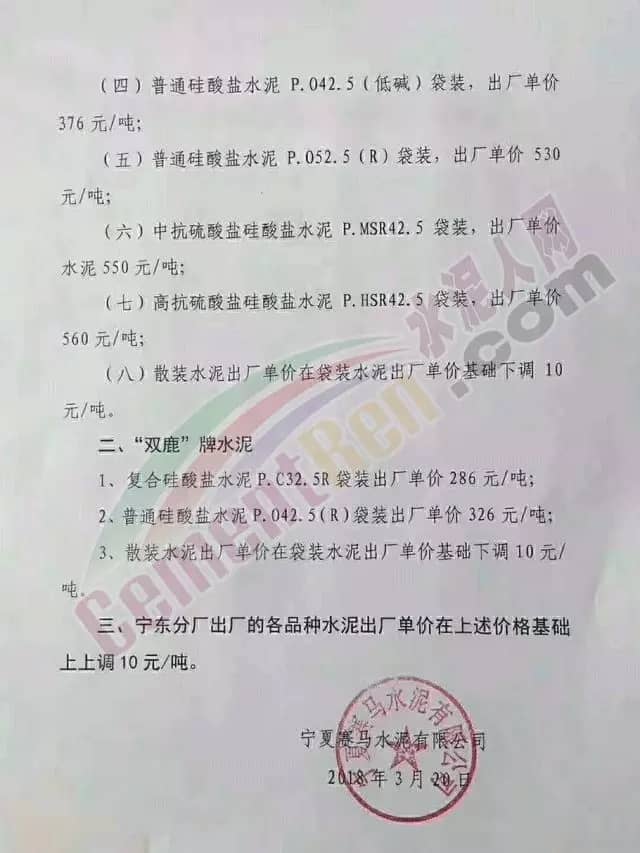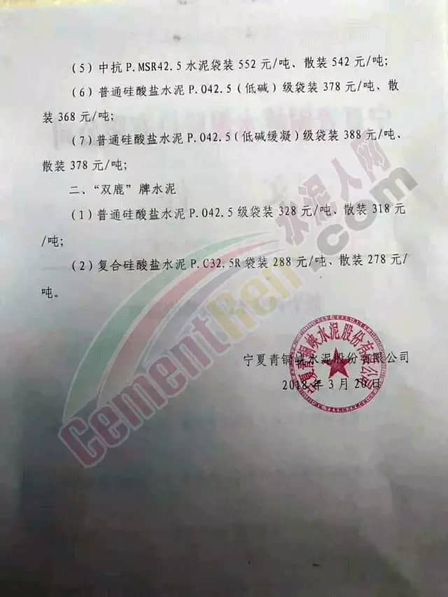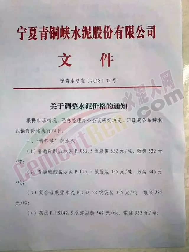 寧夏青銅峽水泥股份有股公司調(diào)價通知