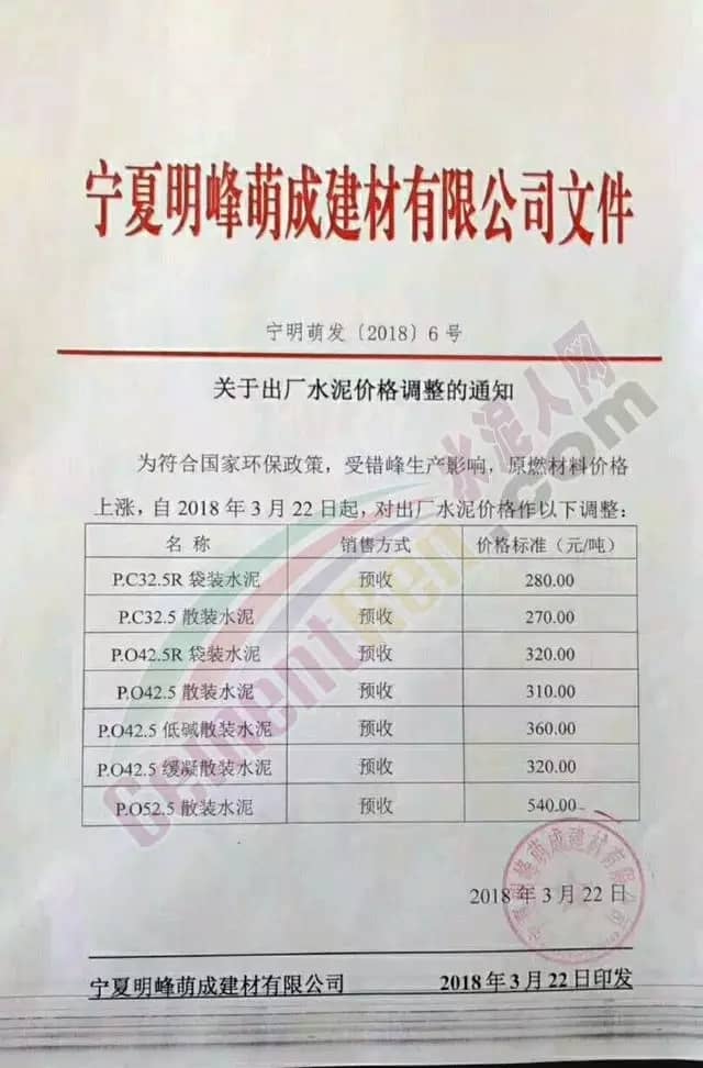 寧夏明峰萌成建材有限公司調(diào)價通知