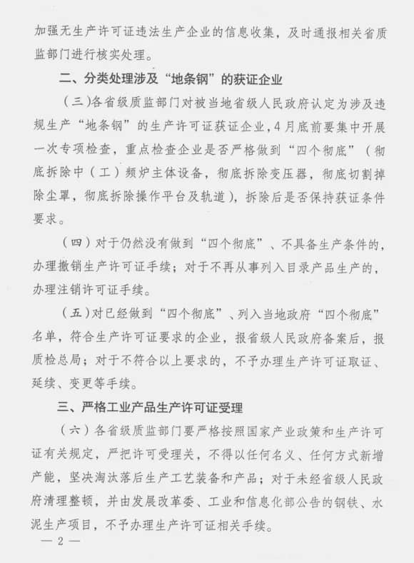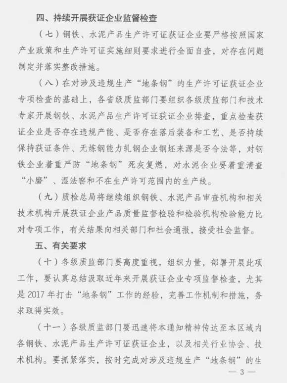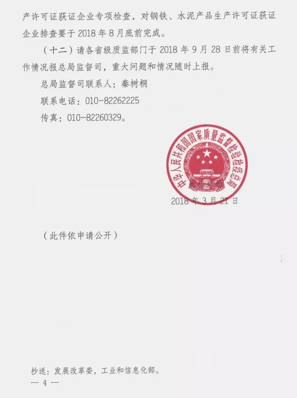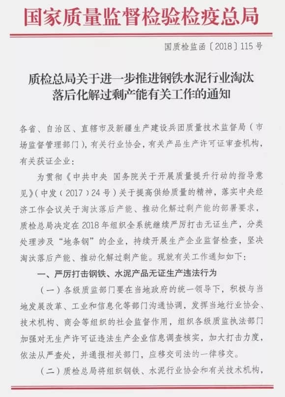 通知稱,為貫徹《中共中央國(guó)務(wù)院關(guān)于開(kāi)展質(zhì)量提升行動(dòng)的指導(dǎo)意見(jiàn)》(中發(fā)[2017]24號(hào)文)關(guān)于提高供給質(zhì)量的精神,落實(shí)中央經(jīng)濟(jì)工作會(huì)議關(guān)于淘汰落后產(chǎn)能、推動(dòng)化解過(guò)剩產(chǎn)能的部署要求,國(guó)家質(zhì)檢總局決定在2018年組織全系統(tǒng)對(duì)水泥生產(chǎn)許可證進(jìn)行全面排查,繼續(xù)嚴(yán)厲打擊無(wú)證生產(chǎn),持續(xù)開(kāi)展生產(chǎn)企業(yè)監(jiān)督檢查工作。
