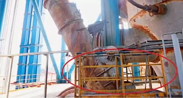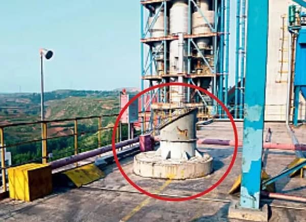 2、水泥廠預(yù)熱器系統(tǒng)下料管清堵孔處用跳板搭設(shè)簡(jiǎn)易平臺(tái),無(wú)防墜落措施,無(wú)逃生通道。作業(yè)過(guò)程容易出現(xiàn)人員高處墜落傷害;如果出現(xiàn)熱物料異常噴出,作業(yè)人員無(wú)法逃離,還會(huì)造成熱物料的高溫灼燙傷害。