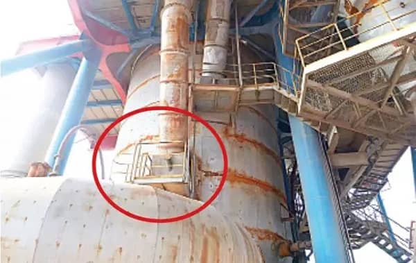 4 、水泥廠預(yù)熱器系統(tǒng)下料管清堵孔處設(shè)置了平臺(tái),且直梯進(jìn)入,平臺(tái)狹窄無(wú)逃生通道。若出現(xiàn)熱物料異常噴出,作業(yè)人員無(wú)法逃離,容易造成熱物料的高溫灼燙傷害。
