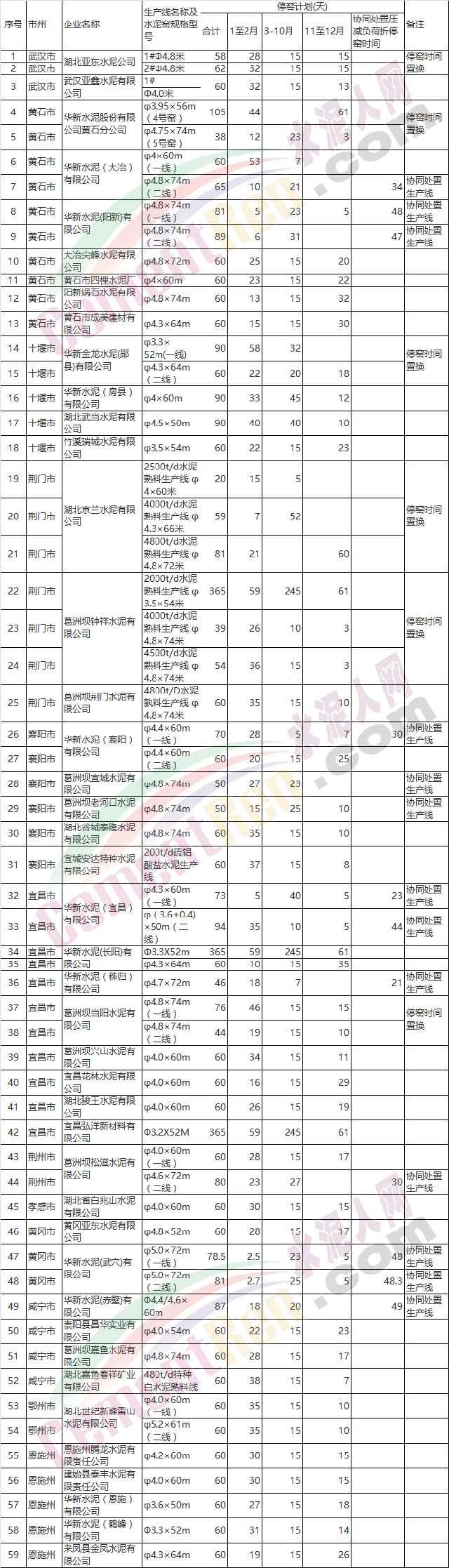 2018年全省水泥企業(yè)錯(cuò)峰生產(chǎn)計(jì)劃匯總表