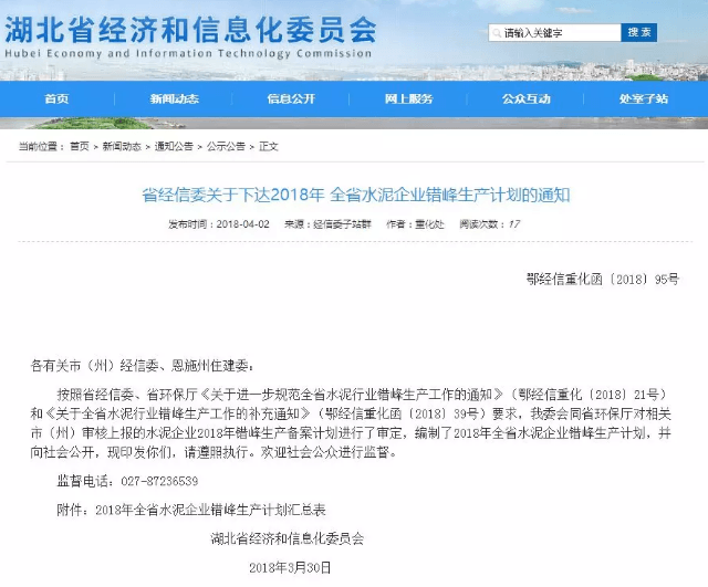【水泥人網(wǎng)】日前,湖北省經(jīng)信委下發(fā)《關(guān)于2018年全省水泥企業(yè)錯(cuò)峰生產(chǎn)計(jì)劃的通知》,通知稱按照省經(jīng)信委、省環(huán)保廳《關(guān)于進(jìn)一步規(guī)范全省水泥行業(yè)錯(cuò)峰生產(chǎn)工作的通知》(鄂經(jīng)信重化〔2018〕21號(hào))和《關(guān)于全省水泥行業(yè)錯(cuò)峰生產(chǎn)工作的補(bǔ)充通知》(鄂經(jīng)信重化函〔2018〕39號(hào))要求,湖北省工信委會(huì)同省環(huán)保廳對(duì)相關(guān)市(州)審核上報(bào)的水泥企業(yè)2018年錯(cuò)峰生產(chǎn)備案計(jì)劃進(jìn)行了審定,編制了2018年全省水泥企業(yè)錯(cuò)峰生產(chǎn)計(jì)劃,并向社會(huì)公開。
