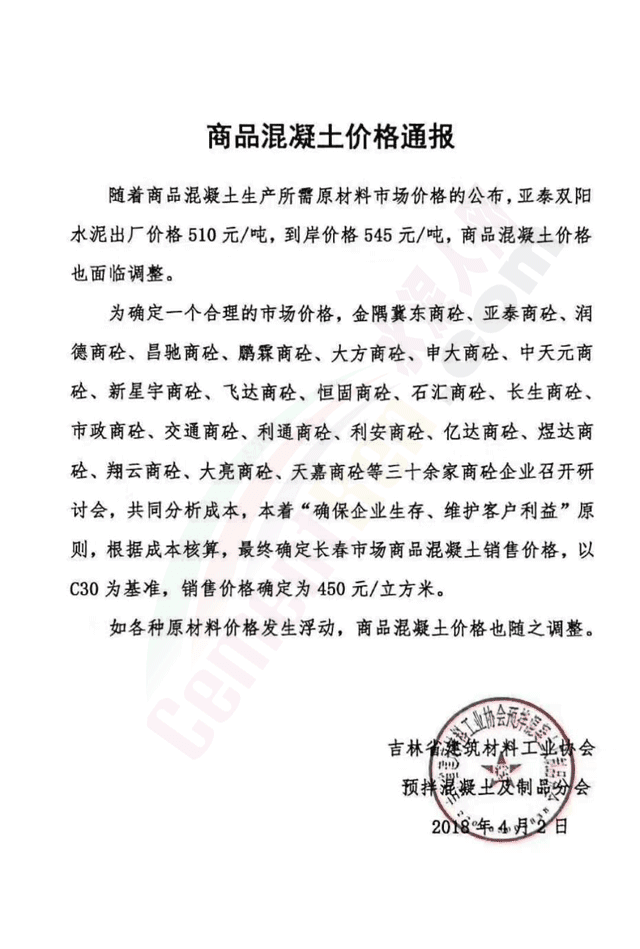為確定一個(gè)合理的市場(chǎng)價(jià)格,金隅冀東商砼、亞泰商砼、潤(rùn)德商砼、昌馳商砼、鵬霖商砼、大方商砼、中天元商砼、新星宇商砼、飛達(dá)商砼、石匯商砼、長(zhǎng)生商砼、市政商砼、交通商砼、利通商砼、利安商砼、億達(dá)商砼、煜達(dá)商砼、翔云商砼、大亮商砼、天嘉商砼等三十余家商砼企業(yè)召開研討會(huì),共同分析,本著“確保企業(yè)生存、維護(hù)客戶利益”原則,根據(jù)成本核算,最終確定長(zhǎng)春市場(chǎng)商品混凝土銷售價(jià)格,以C30為基準(zhǔn),銷售價(jià)格確定為450元/立方米。