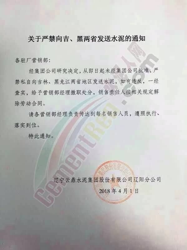 遼寧云鼎水泥集團股份有限公司遼陽分公司4月1日發(fā)布通知,嚴(yán)禁向吉林、黑龍江兩省發(fā)送水泥。通知稱,經(jīng)集團公司研究決定,從即日起未經(jīng)集團公司批準(zhǔn),嚴(yán)禁私自向吉林、黑龍江兩省地區(qū)發(fā)送水泥,如有違反,一經(jīng)查實,給予營銷部經(jīng)理撤職處分,銷售責(zé)任人按相關(guān)規(guī)定解釋勞動合同。
