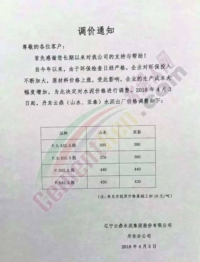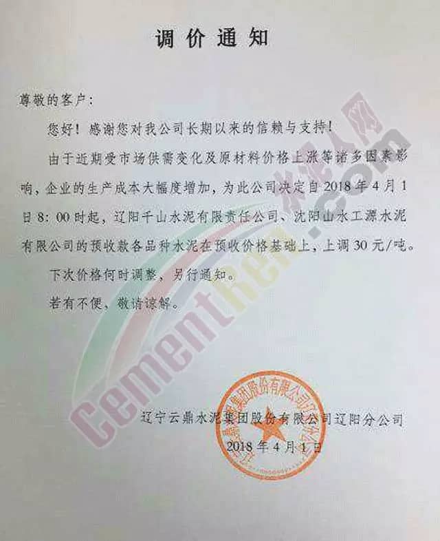 4月1日,遼寧云鼎集團股份有限公司沈陽分公司發(fā)布提價,由于近期市場供需變化,原材料價可靠上漲,企業(yè)的生產(chǎn)成本大幅增加,公司決定自2018年4月1日8點起,亞泰集團鐵嶺水泥有限、遼寧山水工源水泥有限公司、遼寧交通水泥有限公司、吉林亞泰集團(遼寧)建材有限公司沈北分公司、亞泰集團調(diào)兵山水泥有限公司的預(yù)付款、各品種水泥在預(yù)收價格基礎(chǔ)上上調(diào)30元/噸。
