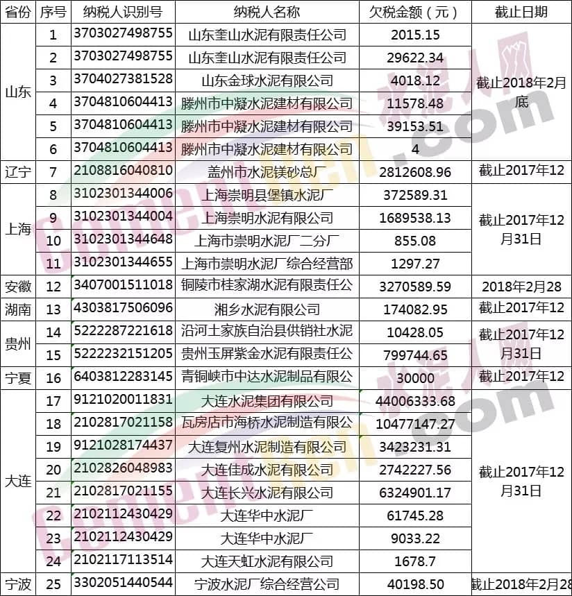 【水泥人網(wǎng)】近日,各省稅務(wù)部門對欠稅企業(yè)進(jìn)行了公示,部分水泥企業(yè)也出現(xiàn)欠稅的情況。據(jù)水泥人網(wǎng)統(tǒng)計(jì),在各地稅務(wù)局公布的最新欠稅名單當(dāng)中,包括21家水泥企業(yè),欠稅金額達(dá)1842.8萬元。具體名單如下:
