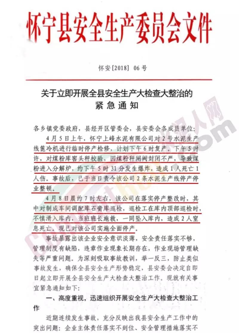 4月8日晨,約7時(shí)左右,該公司在落實(shí)停產(chǎn)整改時(shí),其中對(duì)制成車間調(diào)配庫石膏庫巡檢,巡檢工在庫內(nèi)頂部巡檢時(shí),不慎滑入庫內(nèi),當(dāng)班班長施救,一同墜入庫內(nèi),造成2人窒息死亡,現(xiàn)已對(duì)該公司實(shí)施全面停產(chǎn)。