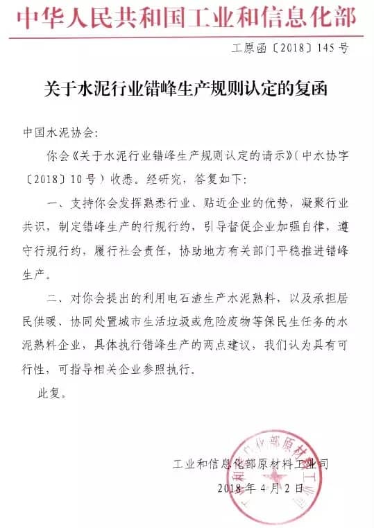 對(duì)中國(guó)水泥協(xié)會(huì)提出的利用電石渣生產(chǎn)水泥熟料以及承擔(dān)居民供暖、協(xié)同處置生活垃圾及危險(xiǎn)廢物等保民生任務(wù)的水泥熟料企業(yè),具體執(zhí)行錯(cuò)峰生產(chǎn)的兩點(diǎn)建議,工信部認(rèn)為具有可行性,可指導(dǎo)相關(guān)企業(yè)參照?qǐng)?zhí)行,予以支持。