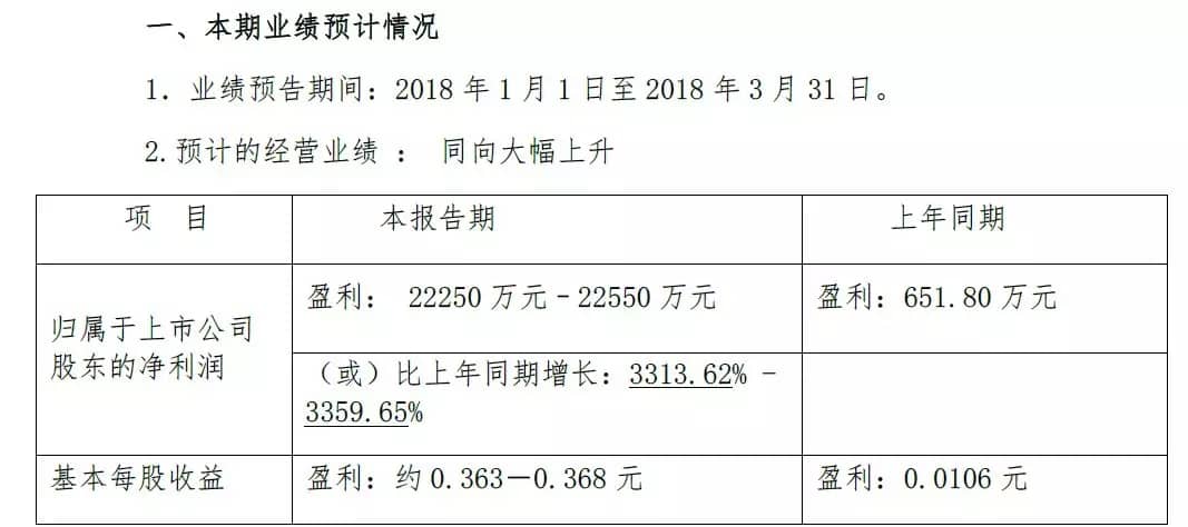 1.經(jīng)財務(wù)部門初步測算,預(yù)計2018年第一季度實現(xiàn)歸屬于上市公司股東的凈利潤與上年同期相比,將實現(xiàn)扭虧為盈,實現(xiàn)歸屬于上市公司股東的凈利潤8600萬元左右。