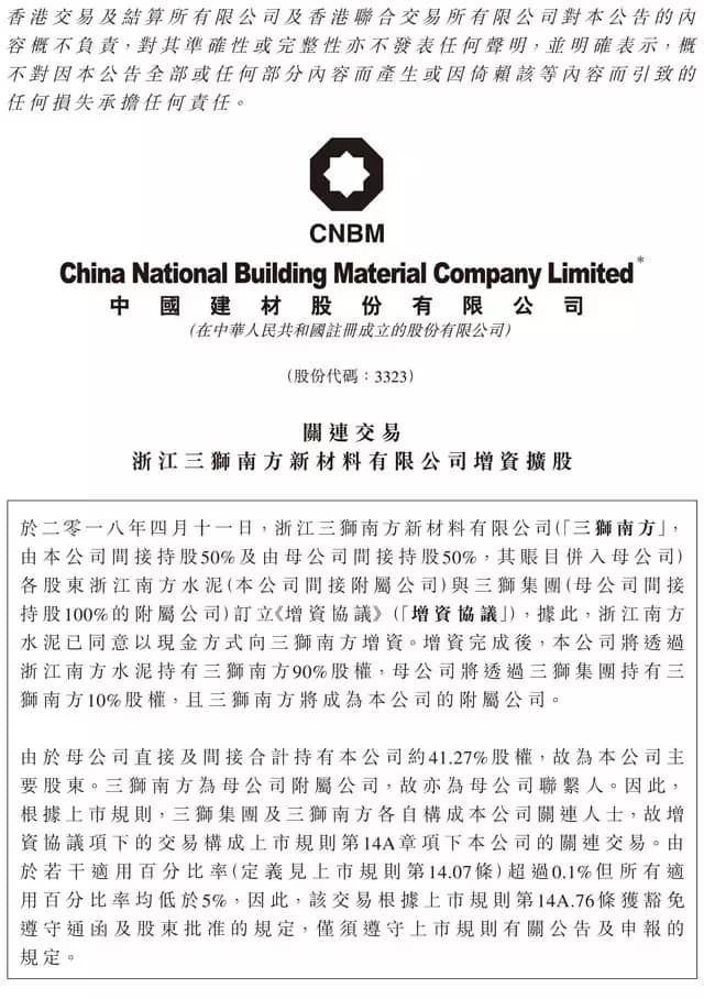 中國建材(9.29, -0.12, -1.27%)(03323)公布,2018年4月11日,由公司間接持股50%、母公司間接持股50%的浙江三獅南方新材料有限公司(“三獅南方”)訂立增資協(xié)議,據(jù)此,公司附屬浙江南方水泥以現(xiàn)金方式向三獅南方增資。其中,新增注冊資本人民幣6.4億元,資本公積金出資人民幣約2.34億元。
