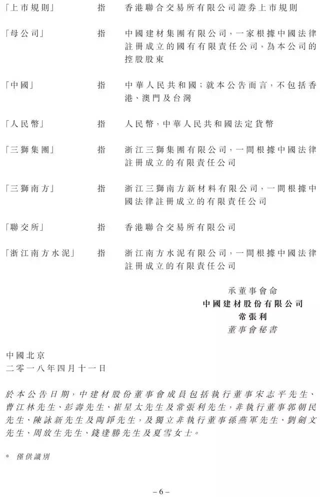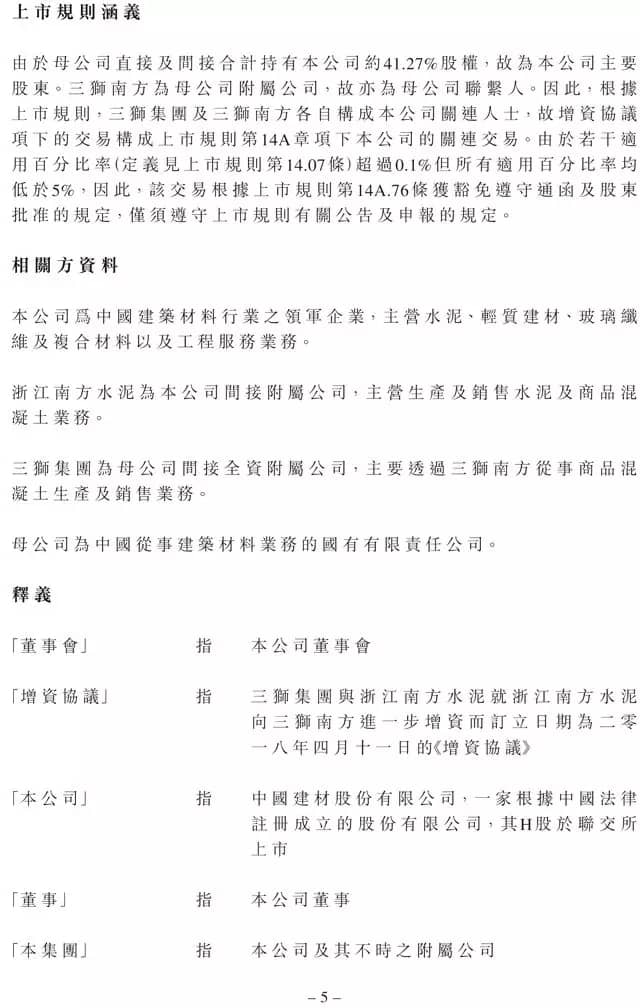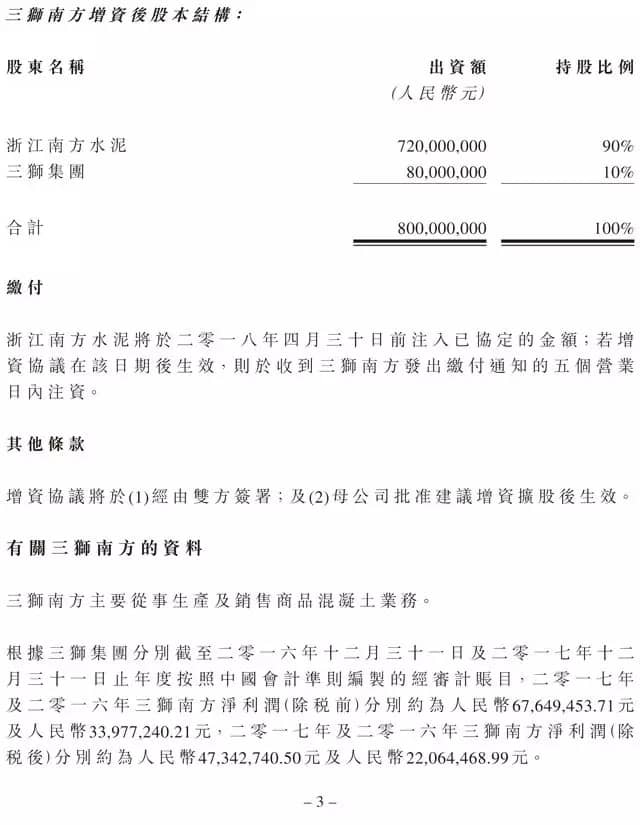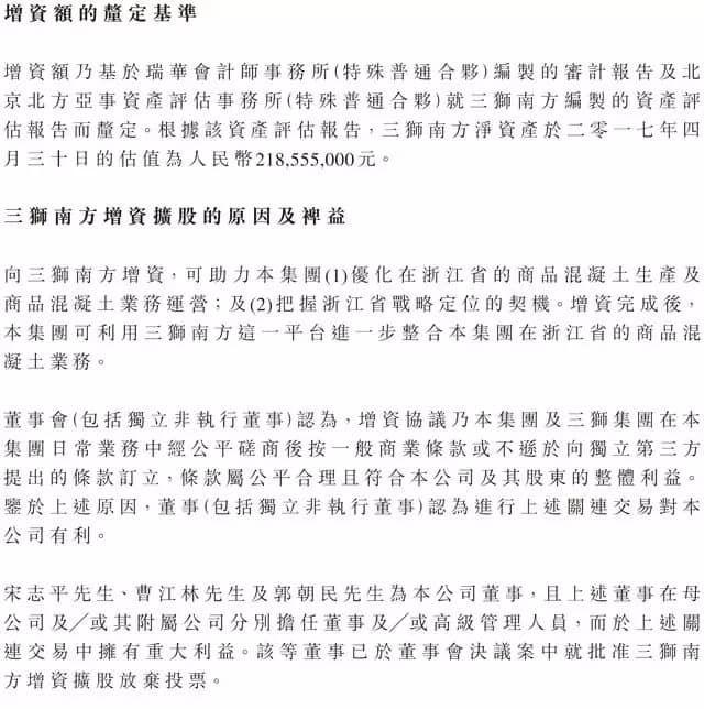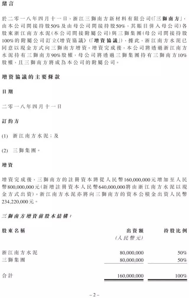 增資完成后,公司透過浙江南方水泥持有三獅南方90%股權,母公司透過三獅集團持有三獅南方10%股權,且三獅南方成為公司的附屬公司。