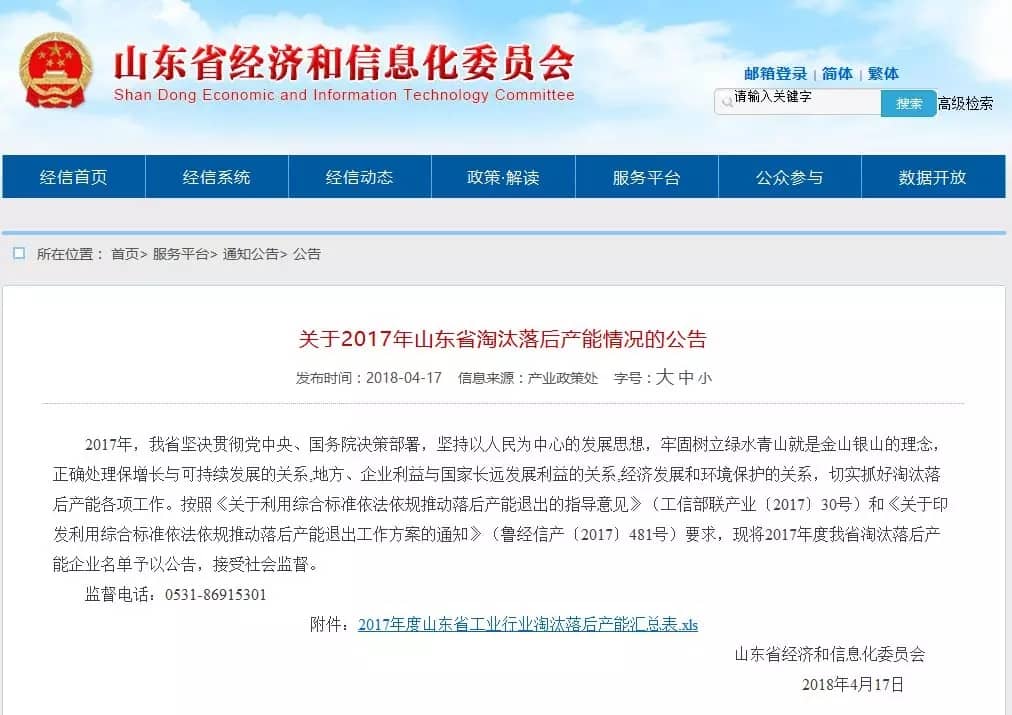 按照《關(guān)于利用綜合標(biāo)準(zhǔn)依法依規(guī)推動落后產(chǎn)能退出的指導(dǎo)意見》(工信部聯(lián)產(chǎn)業(yè)〔2017〕30號)和《關(guān)于印發(fā)利用綜合標(biāo)準(zhǔn)依法依規(guī)推動落后產(chǎn)能退出工作方案的通知》(魯經(jīng)信產(chǎn)〔2017〕481號)要求,將2017年度我省淘汰落后產(chǎn)能企業(yè)名單予以公告,并接受社會監(jiān)督。