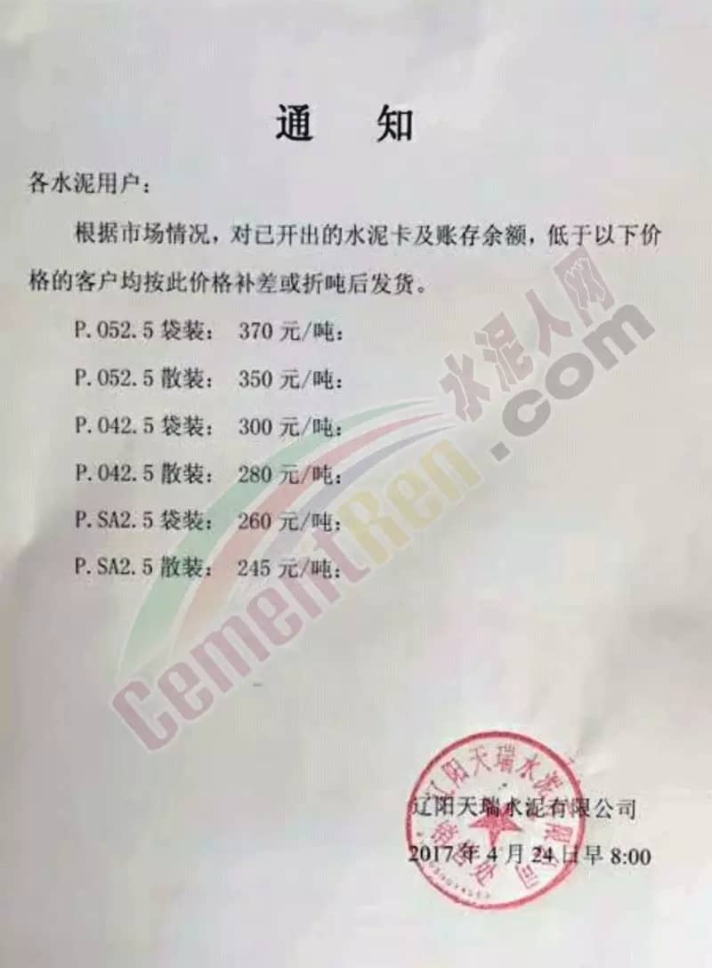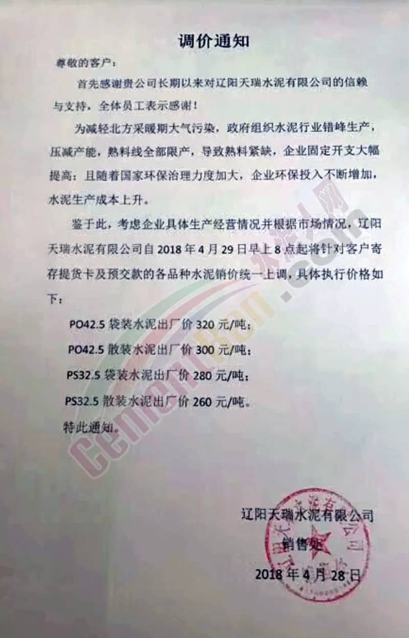 鑒于以上原因,考慮企業(yè)具體生產(chǎn)經(jīng)營情況并根據(jù)市場情況,遼陽天瑞水泥有限公司自2018年4月29早8點(diǎn)起針對(duì)客戶寄存提貨卡及預(yù)交待的各品種水泥銷價(jià)統(tǒng)一上調(diào)。