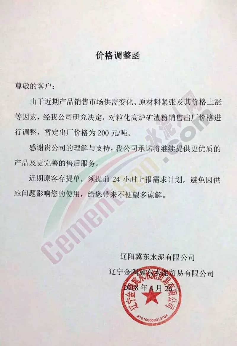 另據(jù)消息稱,4月26日遼陽冀東水泥有限公司遼寧金隅冀東水泥貿(mào)易有限公司發(fā)布通知因近期產(chǎn)品銷售市場供需變化、原材料緊張及其價(jià)格上漲等因素,經(jīng)研究決定,對(duì)?;郀t礦渣粉銷售出廠價(jià)格進(jìn)行調(diào)整 ,暫定出廠價(jià)格為200元/噸。且原客存提單,須提前24小時(shí)上報(bào)需求計(jì)劃,避免因供應(yīng)問題影響使用。