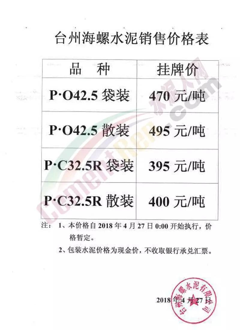 尊敬的客戶:您好!根據(jù)目前市場情況,經(jīng)研究決定,自2018年4月27日下午1:00起,對(duì)寧波海螺公司PO42.5散裝、PO42.5袋裝、PC32.5R散裝水泥出廠價(jià)格上調(diào)40元/噸,對(duì)PC32.5R袋裝水泥出廠價(jià)格上調(diào)30元/噸,特此通知。