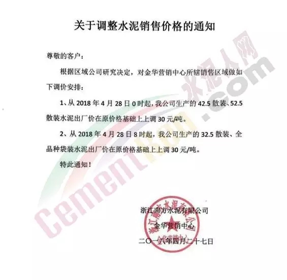 浙江南方水泥有限公司金華營銷中心通知自4月28日0時(shí)起上調(diào)42.5及以上高標(biāo)號(hào)散裝水泥價(jià)格30元/噸。自4月28日早8時(shí)起上調(diào)32.5散裝及全品種袋裝水泥價(jià)格30元/噸。