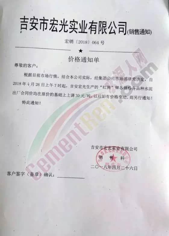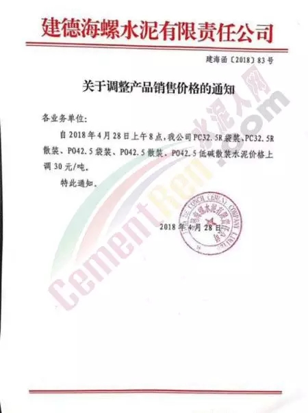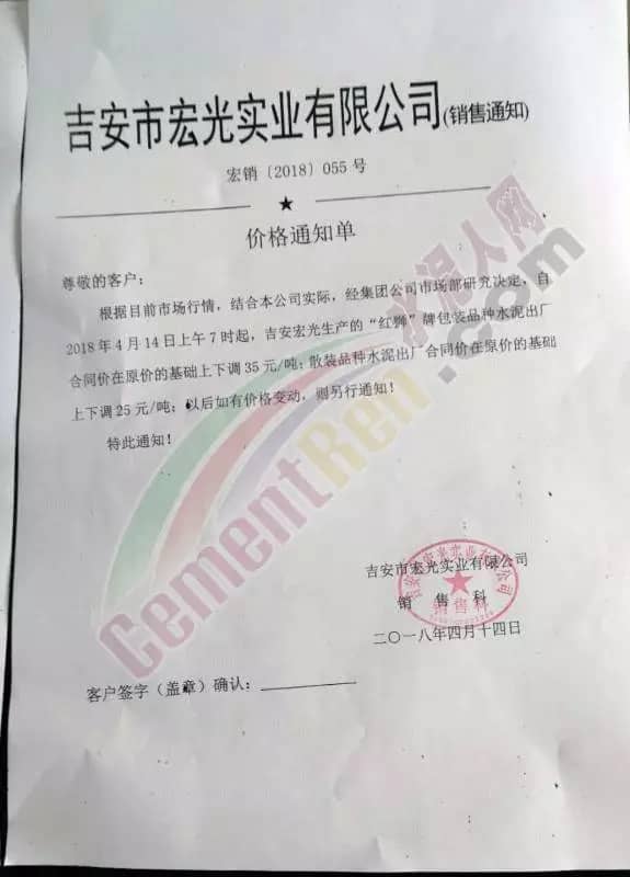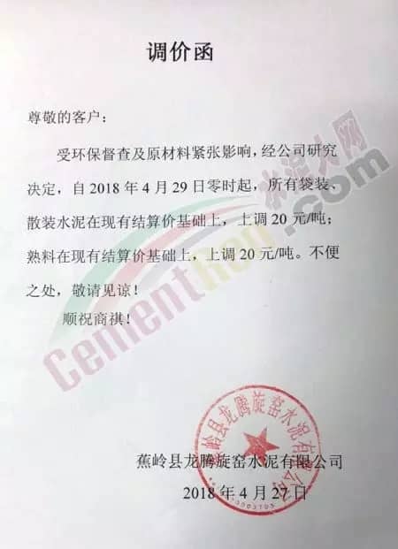 根據(jù)當(dāng)前市場形勢(shì)及我司生產(chǎn)情況,我公司決定于2018年4月27日上午8:00上調(diào)各品種袋裝、散裝水泥20元/噸,價(jià)格上調(diào)以我司出廠過磅時(shí)間為準(zhǔn),如您繼續(xù)安排提貨,則視為認(rèn)同此次價(jià)格調(diào)整。順祝商祺!