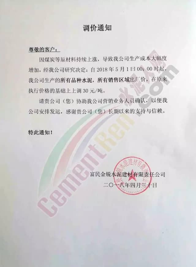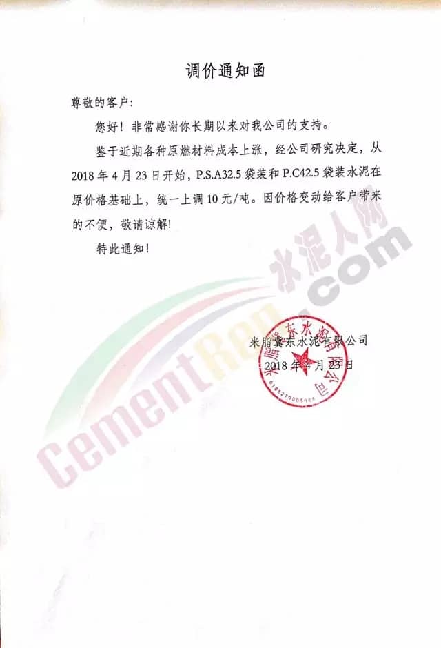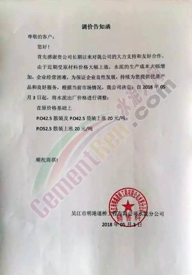 同期,甘肅平?jīng)龊B菟嗤ㄖ掠慰蛻?,根?jù)當(dāng)前公司的產(chǎn)銷形勢(shì),PO42.5散裝水泥在原價(jià)基礎(chǔ)上上調(diào)15元/噸。
