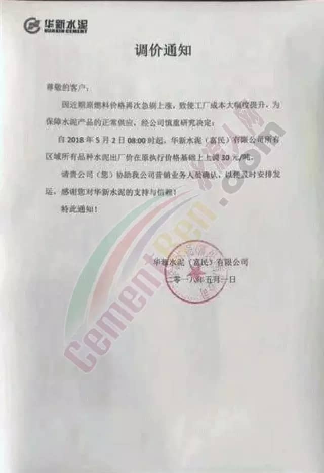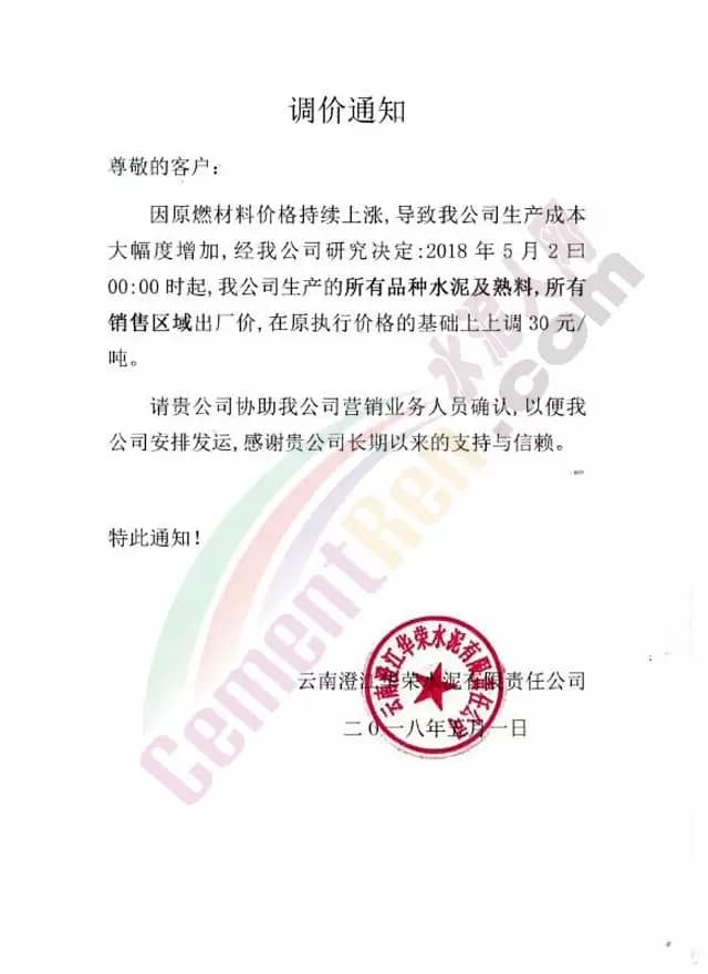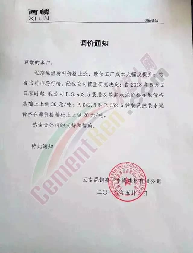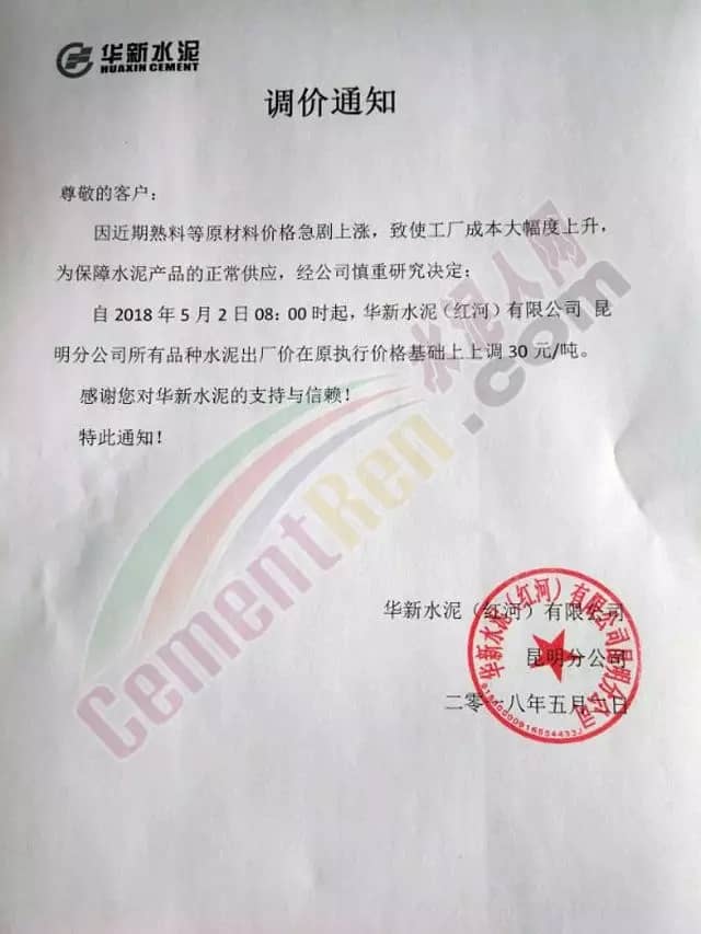 據(jù)水泥人網(wǎng)了解,自5月1日以來(lái),大昆明區(qū)域,華新水泥、昆鋼嘉化等多家水泥企業(yè)通知上調(diào)水泥價(jià)格,漲幅在30元/噸。