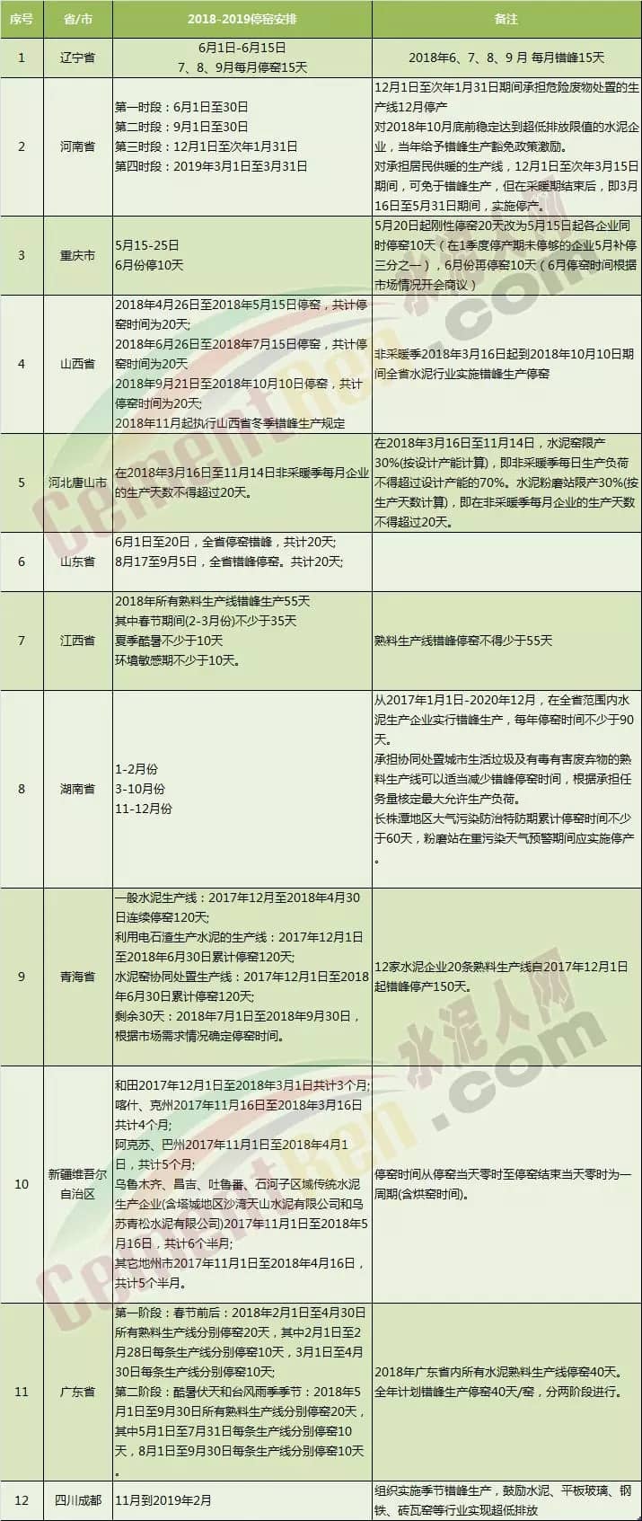 據(jù)水泥人網(wǎng)了解最近一段時(shí)間遼寧、河南、重慶等區(qū)域相繼出臺了2018年錯峰生產(chǎn)計(jì)劃 。其停窯時(shí)間均較往年加長。遼寧、甘肅等區(qū)域行業(yè)協(xié)會和主導(dǎo)企業(yè)也組織了非采暖季的錯峰停產(chǎn)相關(guān)會議,遼寧部分地區(qū)主導(dǎo)企業(yè)計(jì)劃在5-6月份停窯限產(chǎn)30日,甘肅省內(nèi)主導(dǎo)企業(yè)于5月9日召開了錯峰生產(chǎn)協(xié)調(diào)會議,就非采暖季錯峰生產(chǎn)計(jì)劃做了布署。