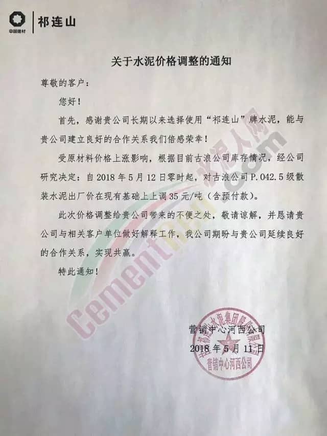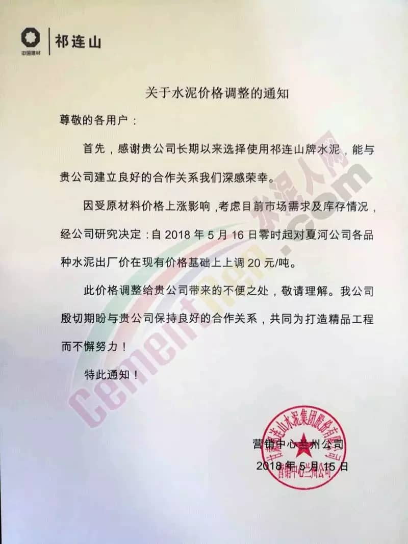 無獨(dú)有偶,祁連山水泥營(yíng)銷中心河西公司昨日也同步發(fā)通知給下游客戶稱,因原材料價(jià)格上漲影響根據(jù)古浪公司庫存情況,經(jīng)公司研究決定自今日(5月16日)零時(shí)起對(duì)古浪公司部分標(biāo)號(hào)水泥價(jià)格進(jìn)行上調(diào)。