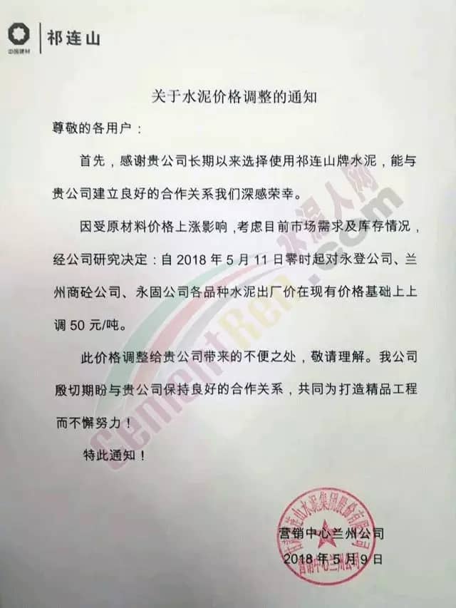 這家企業(yè)曾于5月11日零時(shí)上調(diào)過一次價(jià)格,主要針對(duì)蘭州區(qū)域的永登公司、蘭州商砼公司、永固公司各品種水泥出廠價(jià)在原基礎(chǔ)上上調(diào)50元/噸。