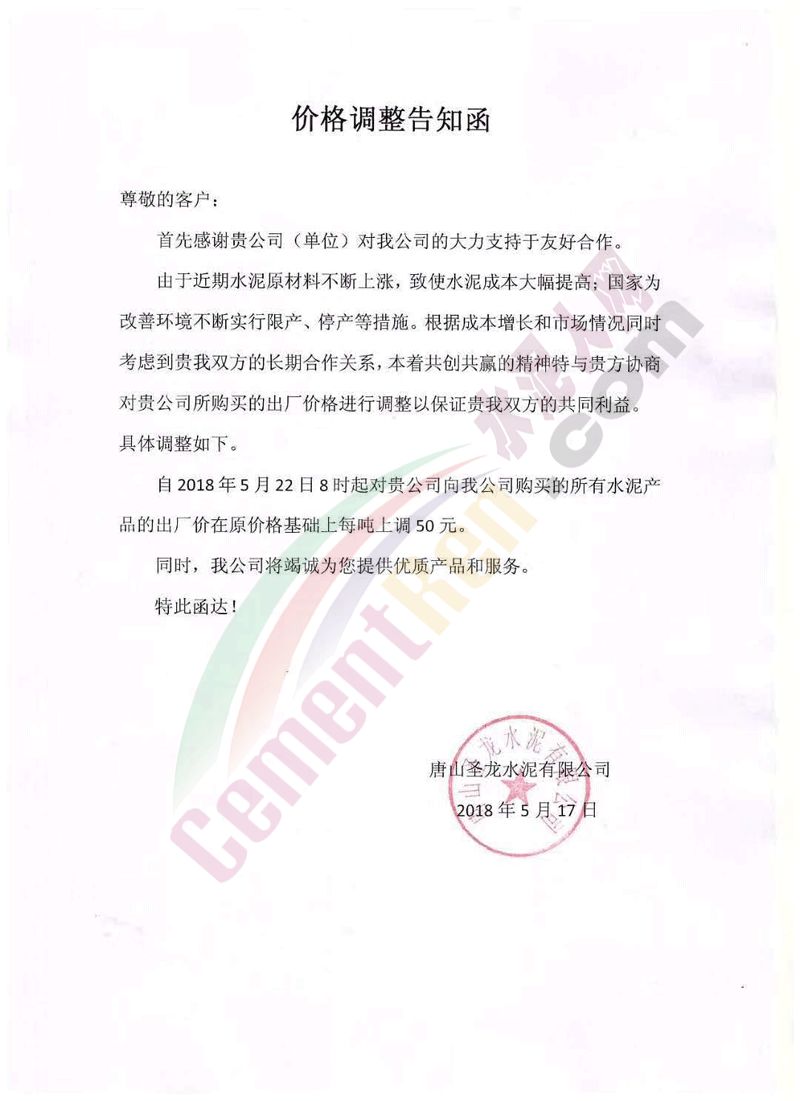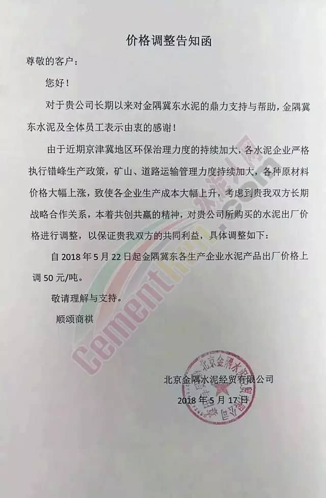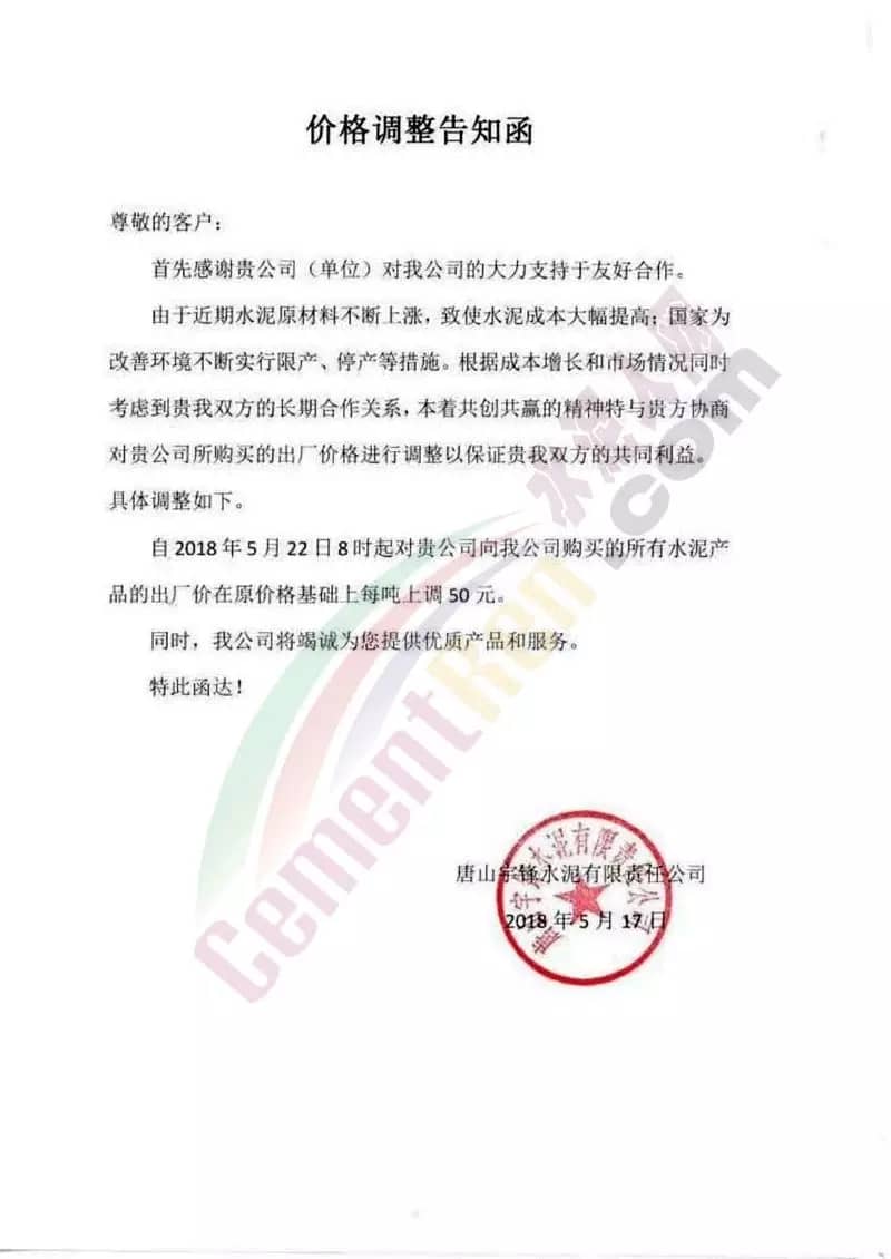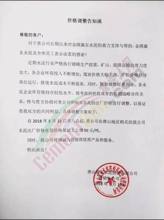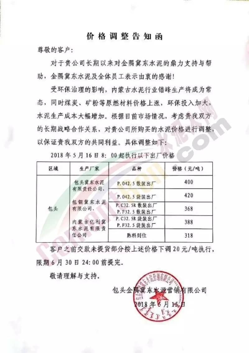 5月16日內蒙古自治區(qū)呼和浩特市區(qū)域主導企業(yè)上調水泥價格同時包頭冀東金隅水泥也發(fā)通知上調水泥價格。