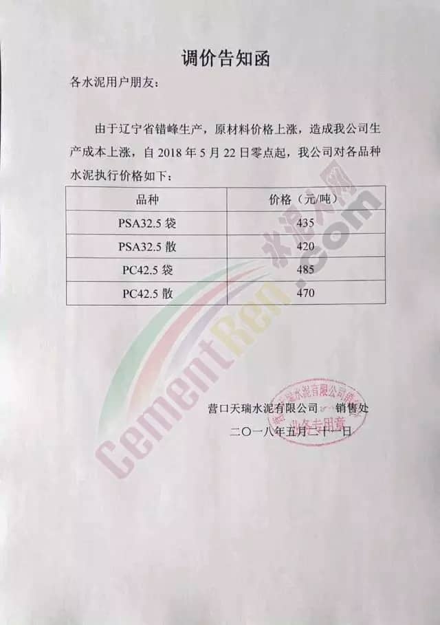 營(yíng)口天瑞水泥調(diào)價(jià)告知函