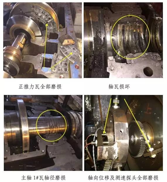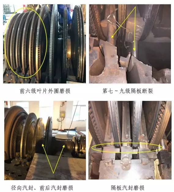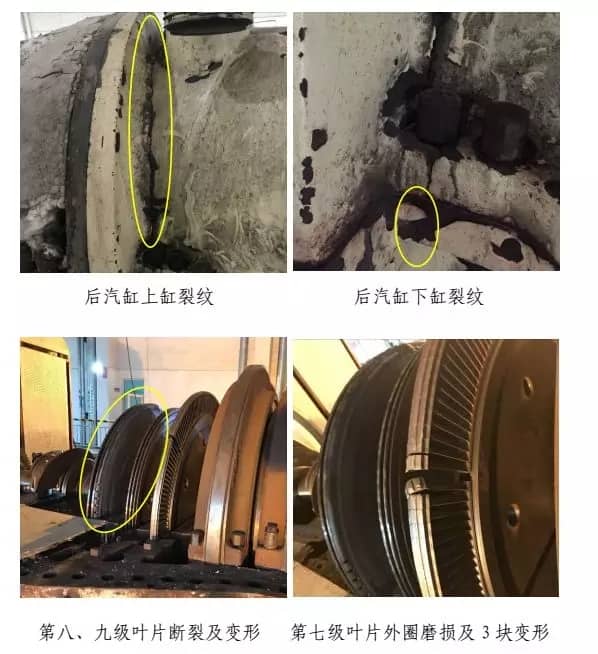 經(jīng)檢查,汽輪機(jī)后缸上、下缸體開裂,第八、九級葉片全部脫落,第七級葉片外圈磨損及 3塊變形,前六級葉片外圈磨損,第七~九級隔板斷裂,隔板汽封、徑向汽封、前后汽封全部磨損,主油泵小軸斷裂及油封環(huán)磨損,主油泵擋油環(huán)斷裂,正推力瓦全部磨損,1#~4#瓦損壞,主軸1#、2#瓦軸徑磨損,軸向位移及測速探頭全部磨損,汽輪機(jī)側(cè)聯(lián)軸器及齒輪位移,盤車電機(jī)殼體斷裂,勵磁機(jī)定轉(zhuǎn)子摩擦損壞,整流盤連接線斷裂及風(fēng)扇葉片磨損,凝汽器約20根銅管受損,發(fā)電機(jī)轉(zhuǎn)子需返廠檢修測試。