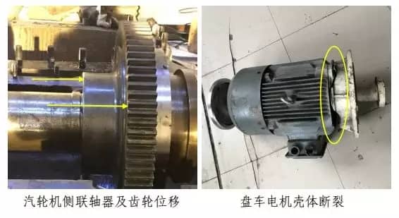 22:40分,公司領(lǐng)導(dǎo)到達(dá)現(xiàn)場,組織人員對現(xiàn)場采取保護(hù)和應(yīng)急處置?;謴?fù)供電后,對 1#機(jī)組進(jìn)行了初步檢查,發(fā)現(xiàn)排氣缸開裂,安全閥沖開,勵磁機(jī)端蓋脫落,手動盤車無法盤動等。在安排專人現(xiàn)場監(jiān)控后向區(qū)域?qū)I(yè)組領(lǐng)導(dǎo)、股份公司相關(guān)部室人員進(jìn)行了匯報。