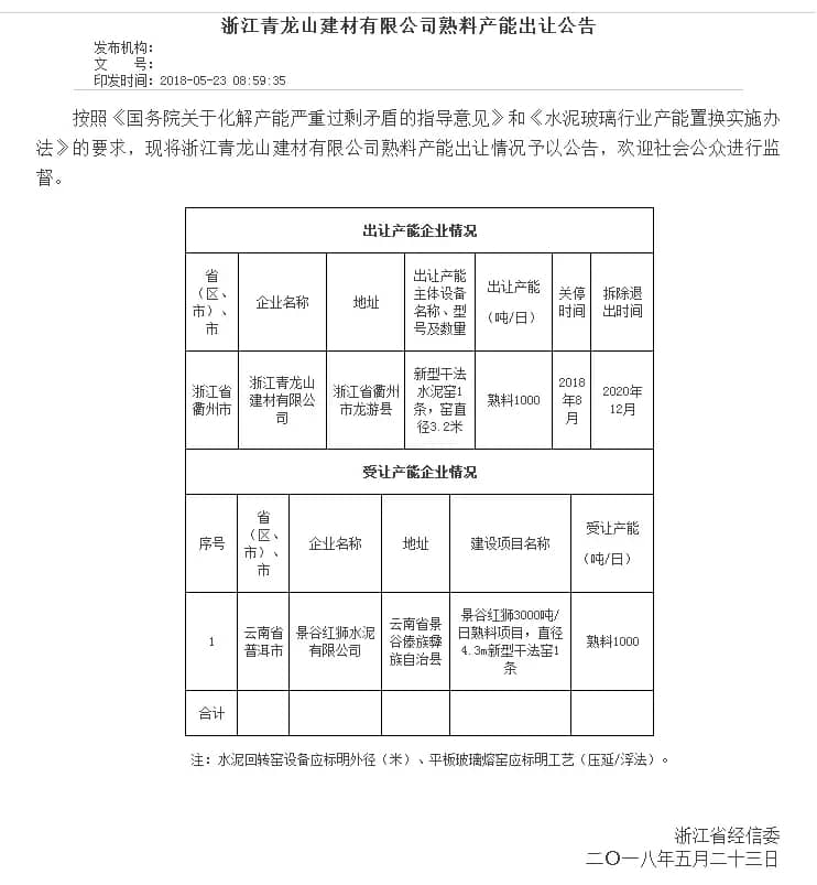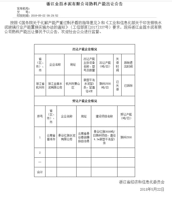 兩則公告中出讓的熟料產(chǎn)能受讓方均為位于云南省景谷傣族彝族自治縣的景谷紅獅水泥有限公司,建設(shè)項目為景谷紅獅3000t/d熟料項目(直徑4.3m新型干法窯1條)。其中由浙江金首水泥有限公司出讓2500t/d熟料產(chǎn)能,浙江青龍山建材有限公司出讓1000t/d熟料產(chǎn)能,合計3500t/d。