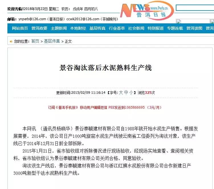 另據(jù)《普洱日報》2015年2月9日消息,景谷泰毓建材有限公司原生產(chǎn)線建設(shè)規(guī)模為日產(chǎn)1000噸旋窯水泥生產(chǎn)線。在2014年被列為淘汰對象,于2014的12月31日前全部拆除。且于2015年1月驗收通過。淘汰該生產(chǎn)線后景谷泰毓建材有限公司與浙江紅獅水泥股份有限公司合作新建日產(chǎn)3000噸新型干法水泥熟料生產(chǎn)線。