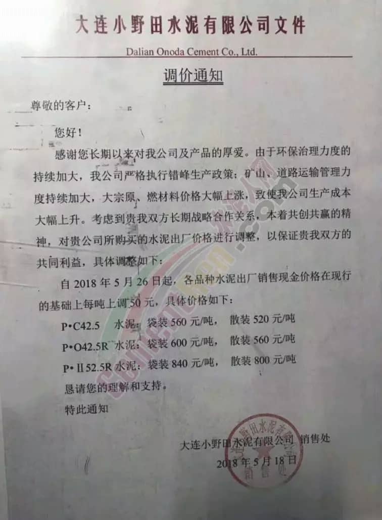【水泥人網(wǎng)】日前,大連小野田水泥有限公司銷售處發(fā)布調(diào)價(jià)通知稱,由于環(huán)保治理力度的持續(xù)大加,公司嚴(yán)格執(zhí)行錯(cuò)峰生產(chǎn)政策;礦山、道路運(yùn)輸管理力度持續(xù)加大,大宗原、燃材料價(jià)格大幅上漲,致使公司生產(chǎn)成本大幅上升。為保證企業(yè)與用戶的共同利益,將水泥價(jià)格上調(diào)。其中P.II52.5R標(biāo)號(hào)袋裝水泥執(zhí)行價(jià)格調(diào)為840元/噸。