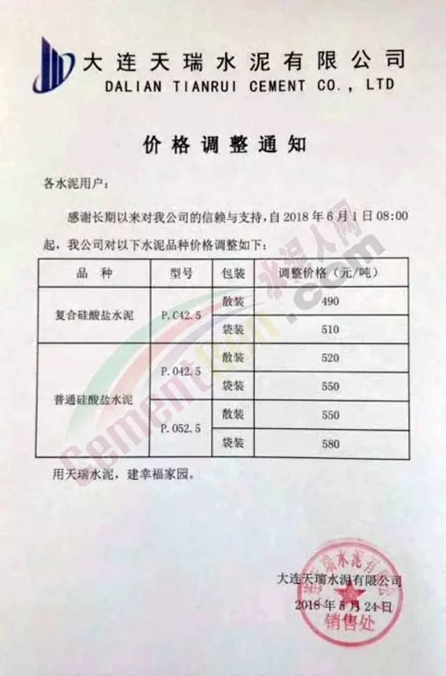 水泥人網(wǎng)信息中心數(shù)據(jù)顯示,同區(qū)域的大連天瑞水泥于5月24日發(fā)布了價(jià)格調(diào)整通知,通知稱自6月1日8點(diǎn)起,水泥銷售執(zhí)行新的價(jià)格體系。