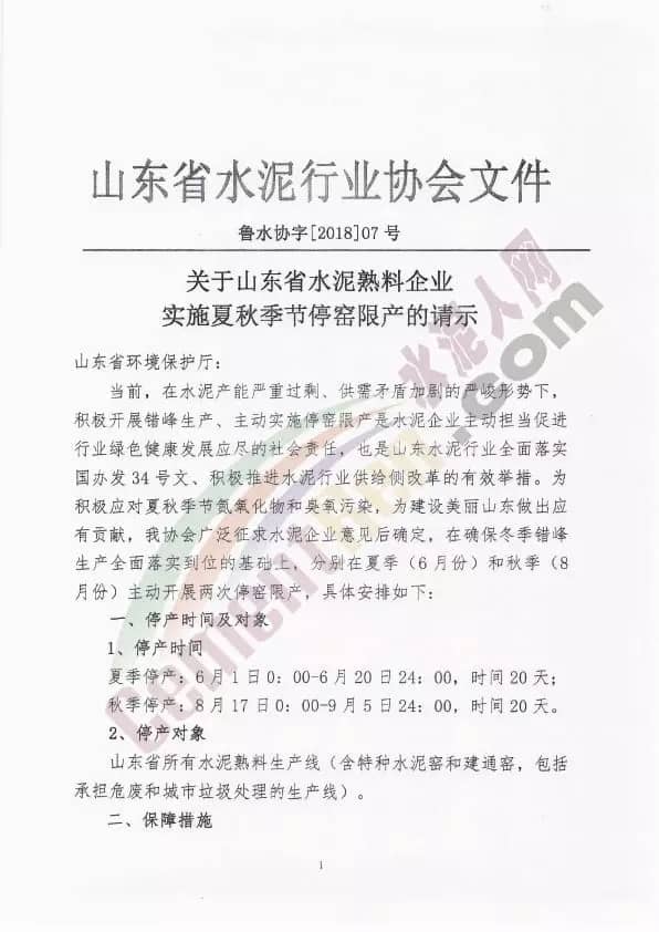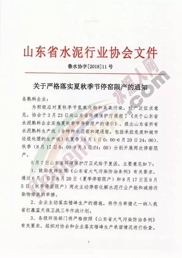 【水泥人網(wǎng)】日前,山東省水泥協(xié)會發(fā)文向山東省環(huán)境保護(hù)廳請示山東省水泥熟料企業(yè)執(zhí)行實(shí)施夏秋季錯(cuò)峰停窯相關(guān)事宜。請示文件稱,為積極應(yīng)對夏秋季節(jié)氮氧化物和臭氧污染,為建設(shè)美麗山東做出應(yīng)有貢獻(xiàn),山東省水泥協(xié)會在廣泛征求水泥企業(yè)意見后確定,在確保冬季錯(cuò)峰生產(chǎn)全面落實(shí)到位的基礎(chǔ)上,分別在夏季(6月份)和秋季(8月份)主動(dòng)開展兩次停窯限產(chǎn)。